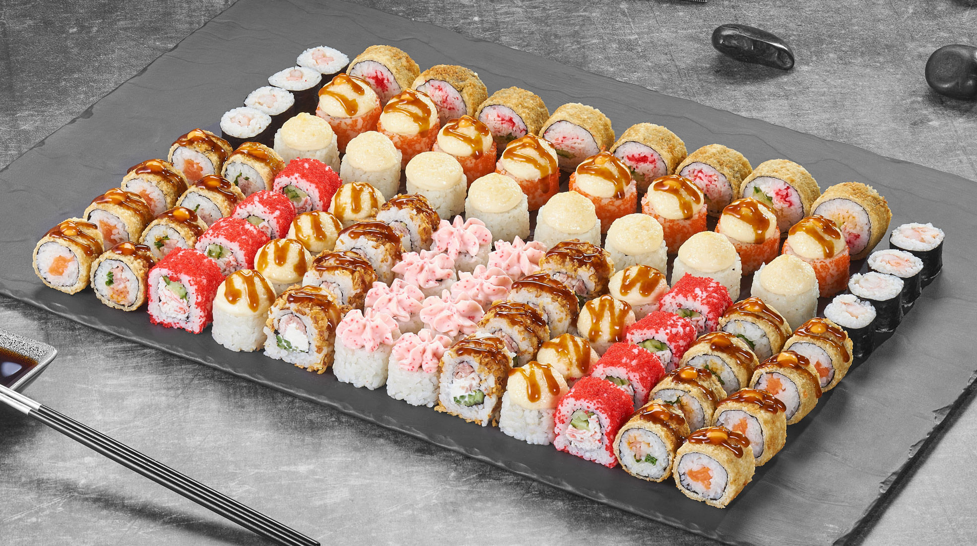 Состав: Ролл Калифорния классика (8 шт.), ролл Лава с крабом (8 шт.), ролл Дон бекон (8 шт.), Мини ролл с креветкой (8 шт.), ролл Сяке лайт темпура (8 шт.), ролл Бекон лайт темпура (8 шт.), ролл Нежный с лососем запеченный (8 шт.), ролл Калифорния темпура (8 шт.), Цезарь ролл запеченный (8 шт.), ролл Чикен спайси запеченный (8 шт.) *Внешний вид блюда может отличаться от фото на сайте.